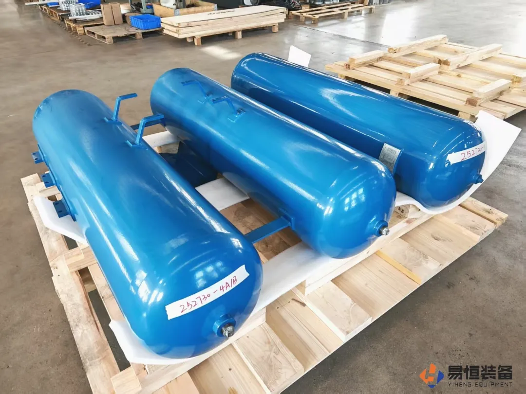 为保障运输安全,所有储气罐、气液罐均采用木质箱体钉装包装,箱体表面明确标识向上、防潮、禁止堆码与吊装等提示,体现了江苏易恒对产品保护的高度重视。